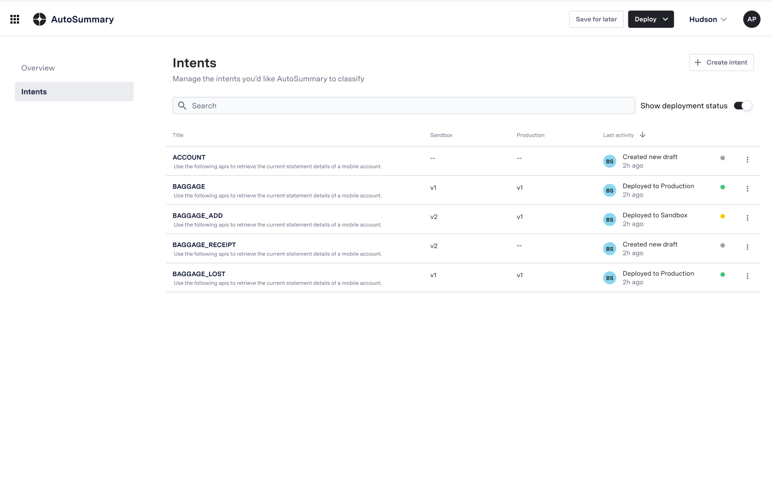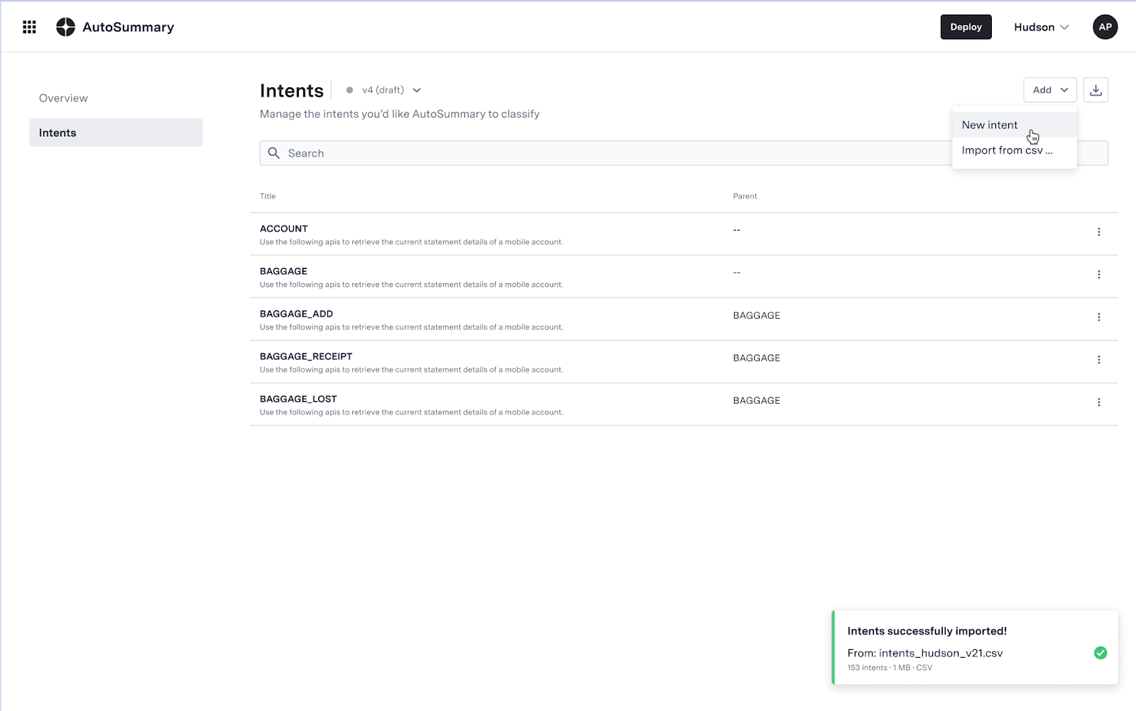 The Intents Self Service tool in ASAPP’s AI Console provides a streamlined interface for managing intent classification. This automated, self-serve UI allows customers to:- Upload, create and modify intent labels without support team intervention