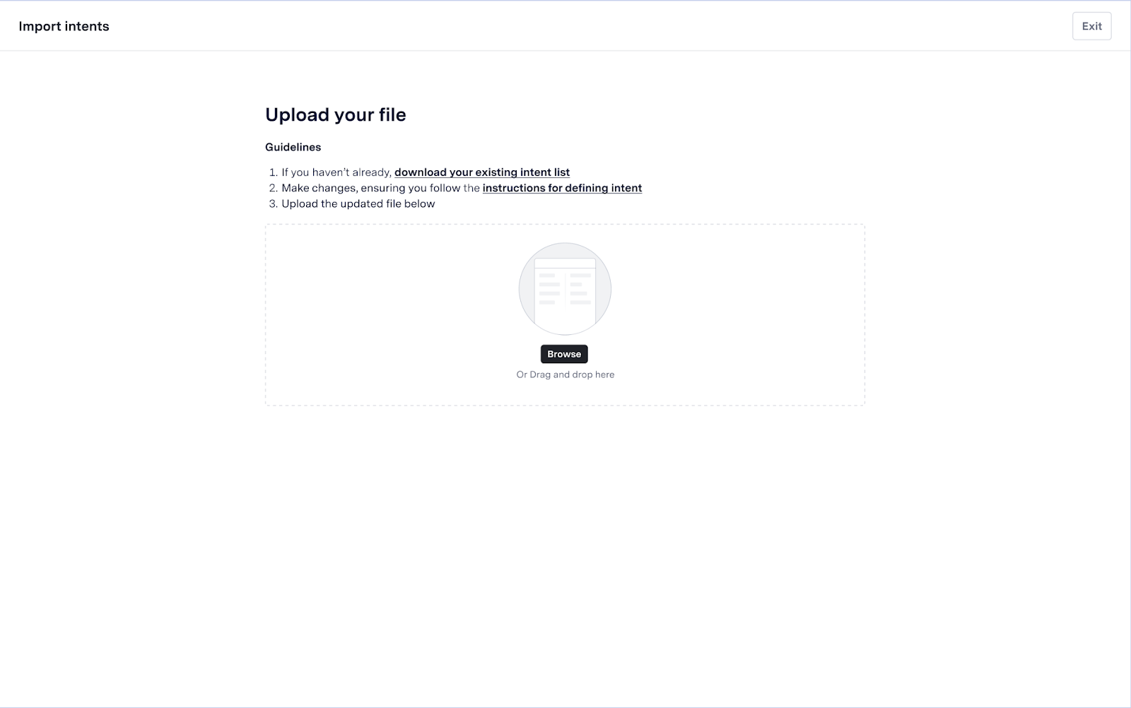 This service is built on a front-end interface, no separate API configuration is required from the customers.Import Flow of Intents- Upload a csv/text file with the intent details, Refer to the provided links in the guidelines to familiarize yourself with the required file format and the necessary information for intents.