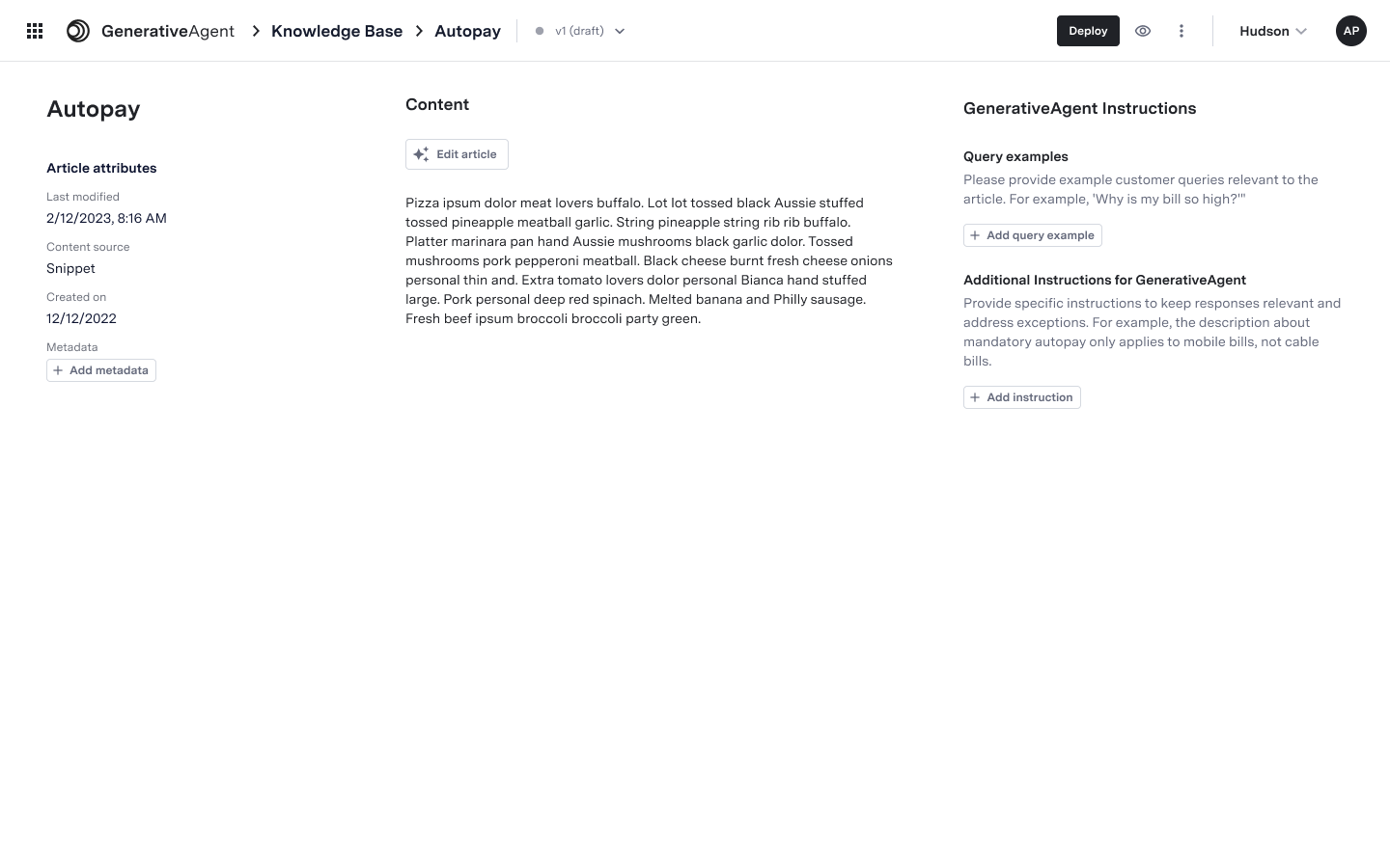 Quickly test live how GenerativeAgent uses your knowledge base:- Click the eye icon next to “Deploy”