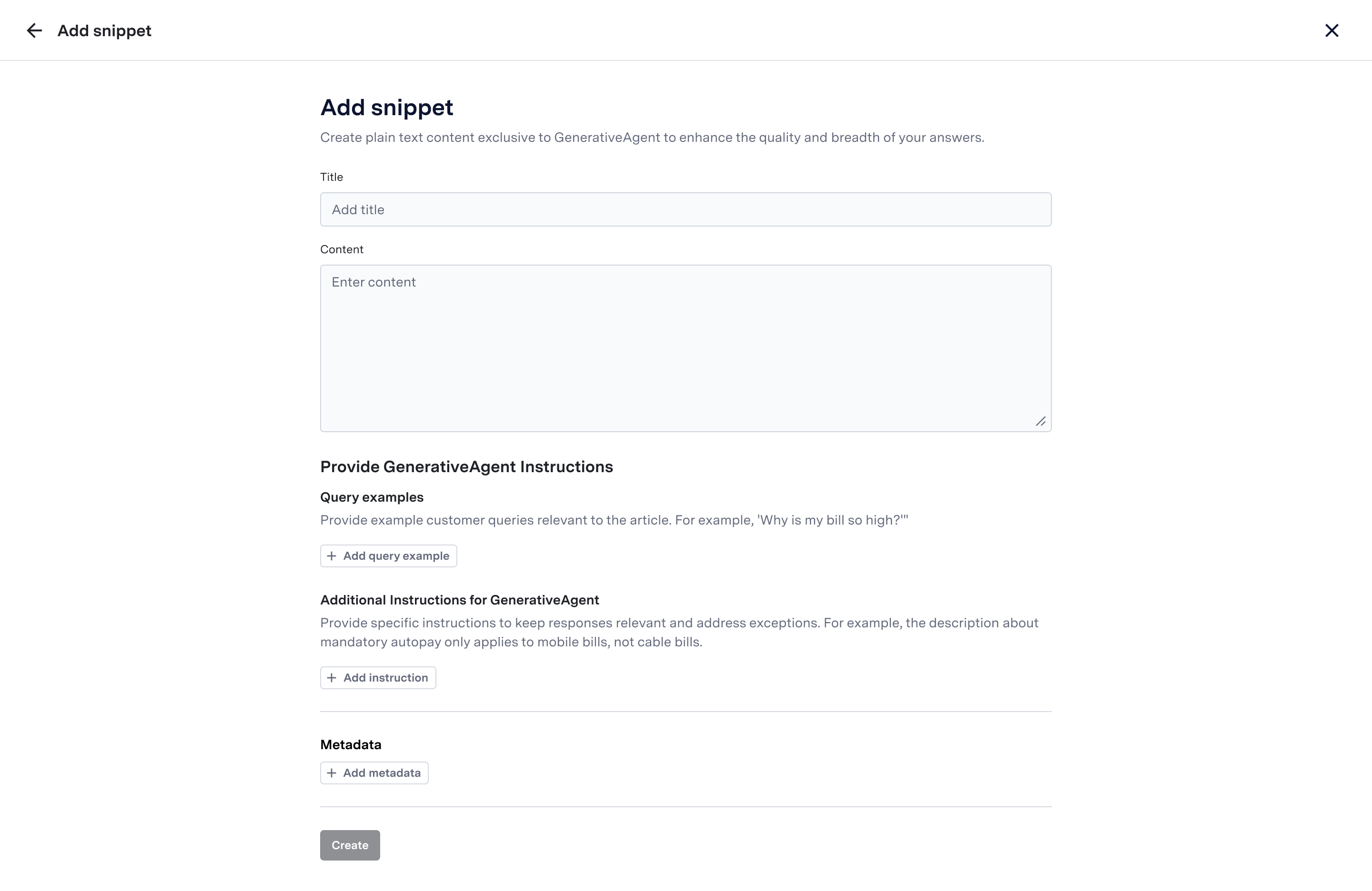 Do not upload internal, agent-facing knowledge base material intended only for live agents. Use GenerativeAgent’s task instructions for internal-only guidance.