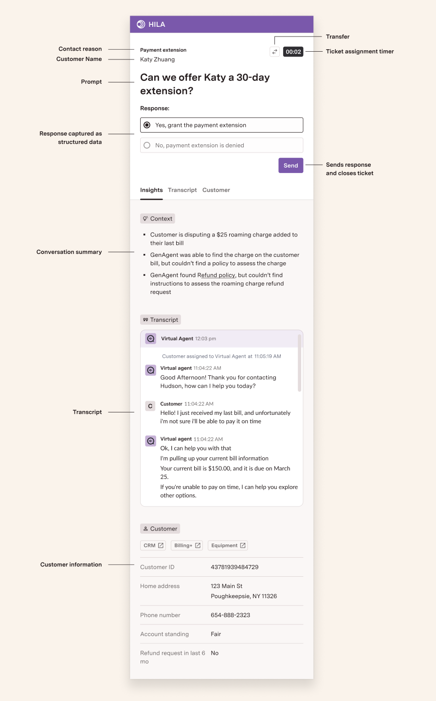 The primary function of the human-in-the-loop is to support and unblock the GenerativeAgent. These supervisors handle tasks requiring approvals or a deep understanding of the issues. Tier 1 agents can address simpler queries. When accepting a ticket from the GenerativeAgent in your digital support tool, agents access an embedded Human-in-the-loop UI. The actions HILAs are set to do include:- Ticket assignments