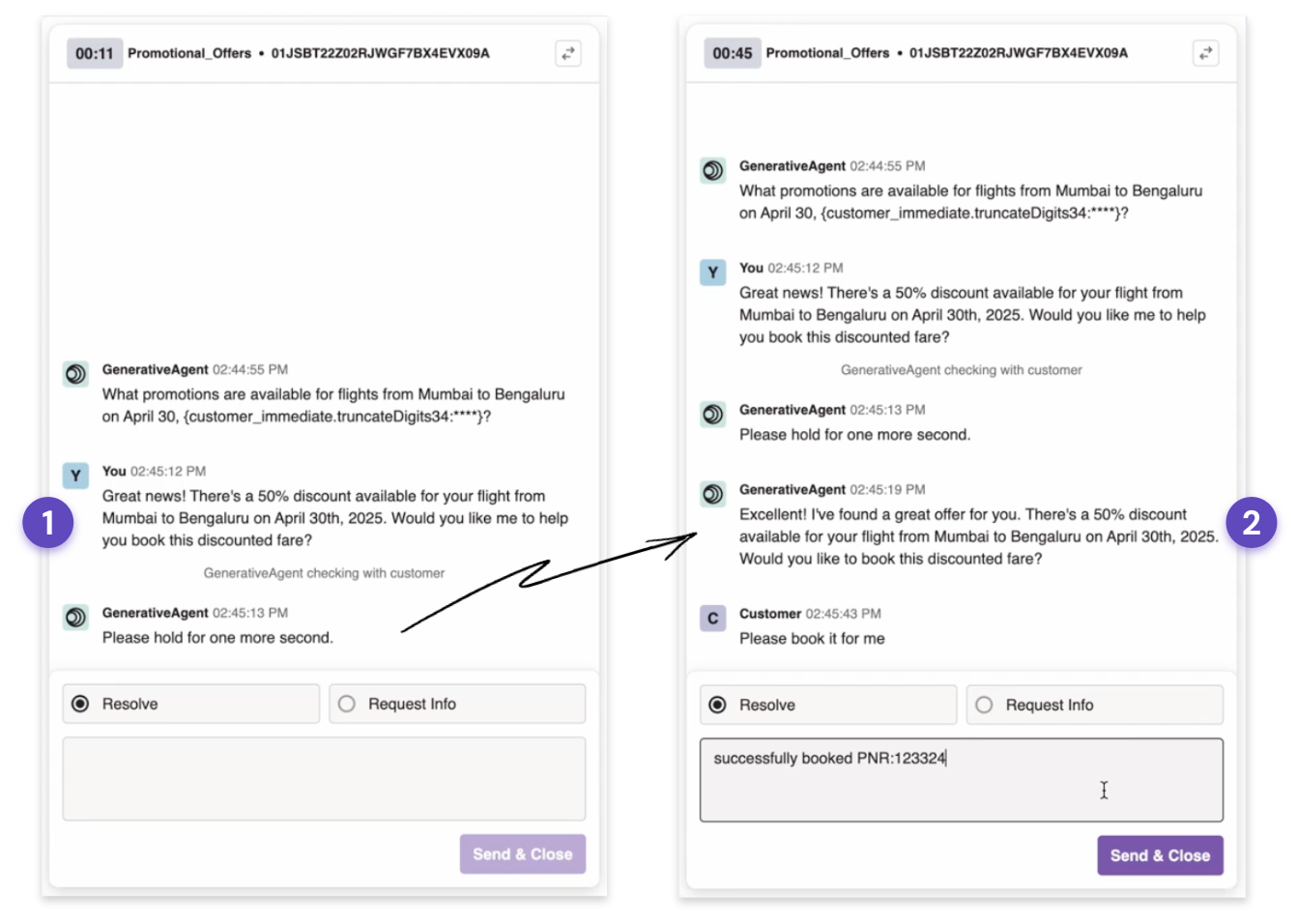 - Prompt & Response: Indicates the specific assistance GenerativeAgent needs to unblock the customer. Human-in-the-Loop Agents respond here as they would to the customer directly — GenerativeAgent will use their response to formulate its own.