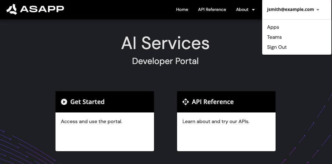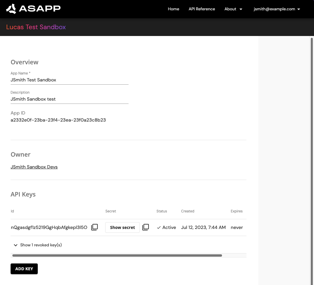 Once you are ready to move to launch with real traffic and move to production, request production access. Tell your ASAPP account team which user will be the Production Developer Portal Admin. ASAPP will create a dedicated production team and app that you can manage as you did for the sandbox team and app.Access API Credentials